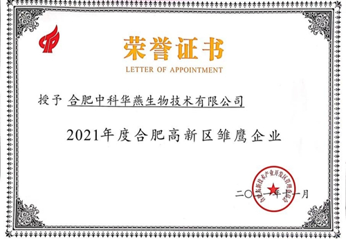 2021年11月11日,合肥市高新區2021年度高成長企業榜單發布,合肥中科華燕生物技術有限公司榮獲合肥高新區“雛鷹企業”。